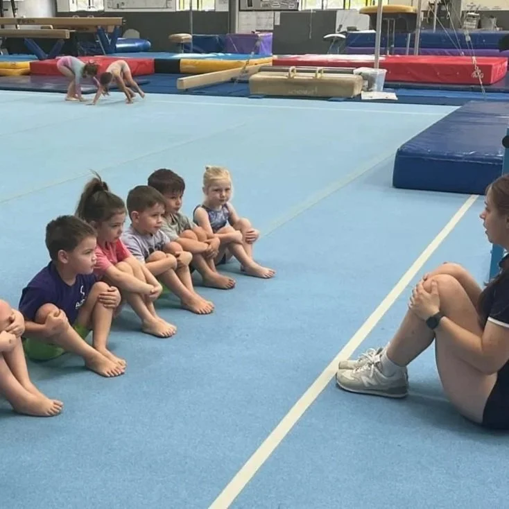 In Senior (4-5 years), the children participate on their own. If they need an extra helping hand you are more than welcome to join us on the floor while everything is new and a transitional time. We encourage children to join our whole group experiences as they explore their gymnastic shapes and movement patterns. We then split into smaller groups to move through our apparatus rotations. We focus on listening, taking turns, following directions and having fun!